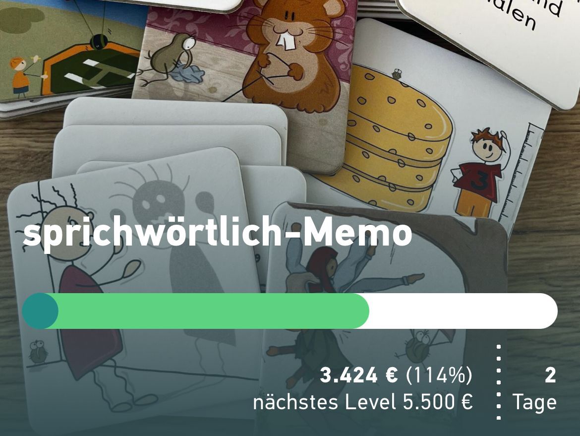 Das Crowdfunding für mein sprichwörtlich-Memo ist super gestartet. Aktuell liegen wir bei 25% des Startkapitals. Damit das Memo produziert werden kann, fehlt aber noch eine ganze Menge. Darum brauche ich eure Unterstützung! Teilt diesen Blogbeitrag oder direkt die Funding-Seite , was das Zeug hält - und ich freue mich natürlich, wenn ihr mich auch unterstützt. Alle Hintergründe, wie es funktioniert und was ihr genau davon habt, erkläre ich im folgenden Video! Vorweg: Ihr verliert kein Geld, wenn das Startkapital nicht zustande kommt, aber ihr erhaltet ein tolles Spiel, wenn es funktioniert!