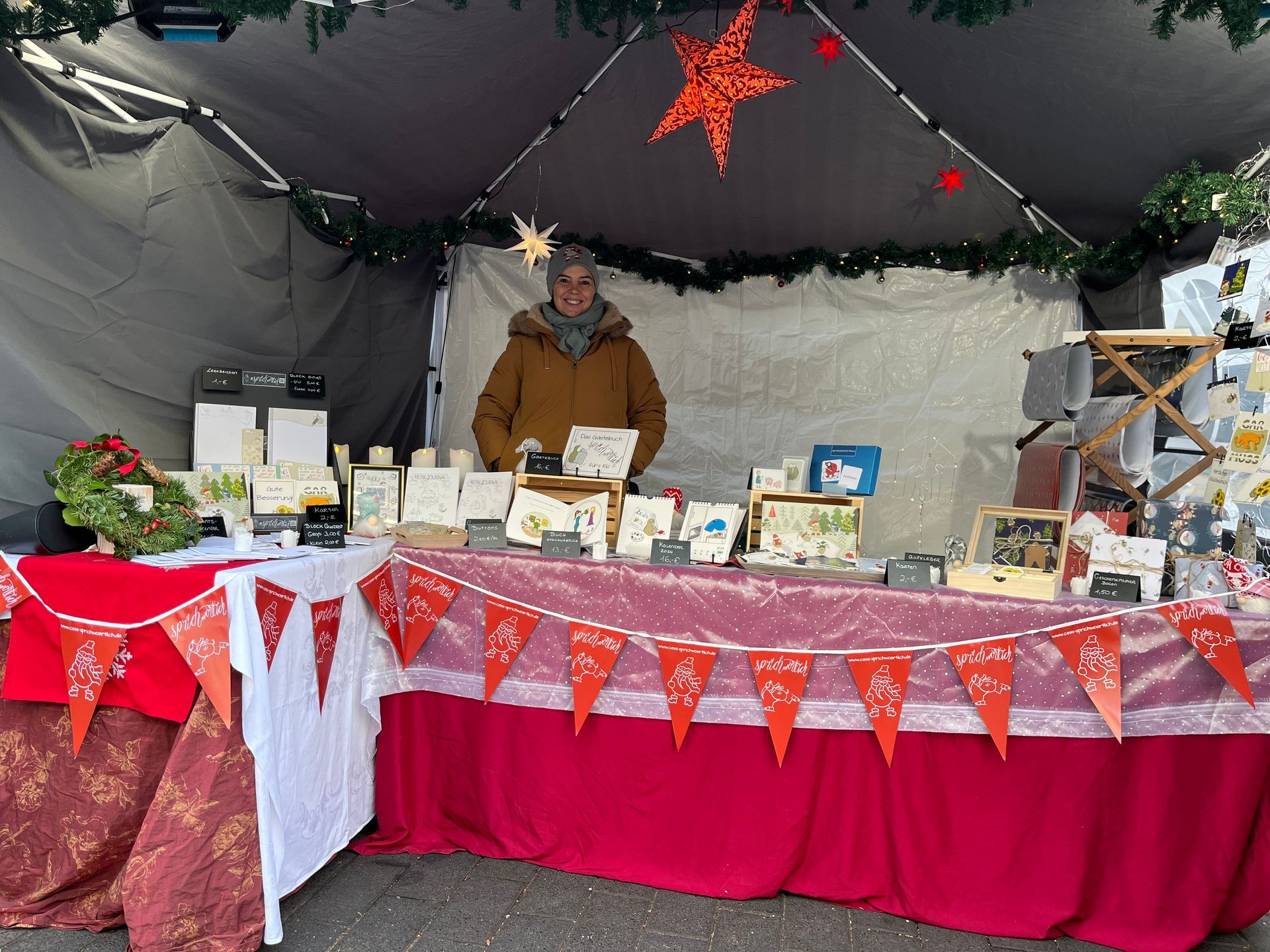Was für eine schöne Erfahrung! Die drei Tage auf dem Hennefer Weihnachtsmarkt haben mega viel Spaß gemacht. Ich habe tolle Leute getroffen und kennengelernt - sowohl unter den Standnachbarn als auch unter den Kunden! Ich habe viele warme Duschen bekommen - so ein positives Feedback zu meinen Artikeln, das ist was ganz Besonderes. Und live nochmal eine ganz andere Sache als online, wenn man die Begeisterung in der Stimme hört und das Strahlen sieht oder jemanden herzhaft laut lachen hört. Und das über meine Produkte. Toll! Natürlich habe ich auch ordentlich dazugelernt! Dass ich zum Beispiel dringend etwas brauche, was deutlich macht, worum es bei sprichwörtlich überhaupt geht. Viele Menschen haben einfach einen Stand mit Papier gesehen. Wer aber nahe genug kam und sich auf ein Gespräch eingelassen hat, war schnell angetan von der Idee dahinter. Viele hatten Spaß beim Mitraten im Kalender, haben herzlich über das Gästebuch fürs Klo gelacht und haben nach den Hintergründen zum Kiwi gefragt. Ich habe nicht gefroren! Auch wenn das auf dem Bild anders aussieht. Aber ich war dank vieler toller Tipps perfekt vorbereitet. Fazit: Ich würde es wieder tun! Nur vielleicht nicht heute oder morgen. ;) Und mit ein paar kleinen Anpassungen. Aber der direkte Kundenkontakt macht einfach so viel Spaß, das ist die Mühe und den Aufwand wirklich wert! Hier noch ein paar Eindrücke der letzten Tage!
