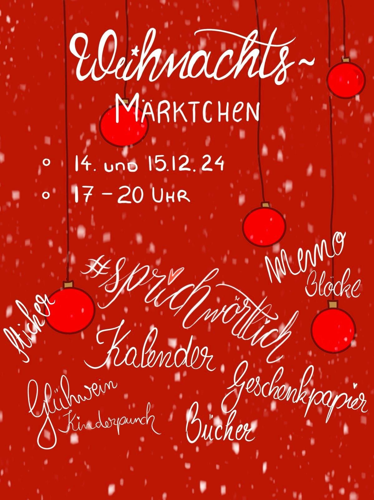 Wer möchte bei meinem privaten kleinen Weihnachtsmärktchen in Bonn dabei sein? Es gibt zwei Daten zur Auswahl. Es wird eine nette Runde, mit Stöbern in sprichwörtlich-Sachen, gemeinsam Klönen und vielleicht einem Glühwein oder Kinderpunsch. Wer etwas zum Knabbern mitbringen möchte, darf das gerne auch tun. Du bist dabei? Dann schreib mich gerne übers Kontaktformular oder über den WhatsApp-Button an, dann gebe ich die Adresse durch.