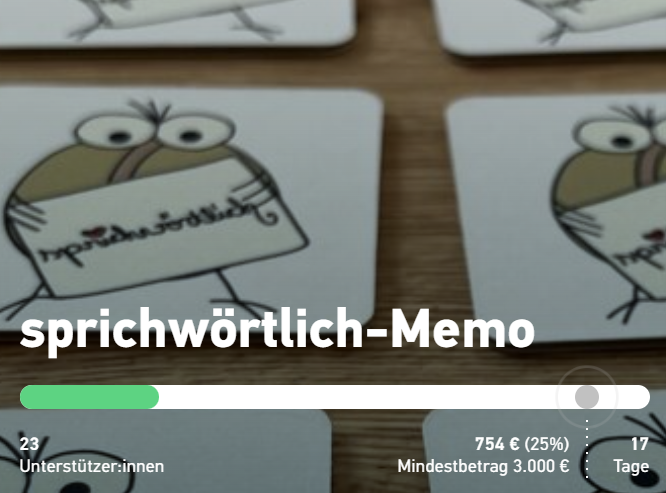 Das Crowdfunding für mein sprichwörtlich-Memo ist super gestartet. Aktuell liegen wir bei 25% des Startkapitals. Damit das Memo produziert werden kann, fehlt aber noch eine ganze Menge. Darum brauche ich eure Unterstützung! Teilt diesen Blogbeitrag oder direkt die Funding-Seite, was das Zeug hält - und ich freue mich natürlich, wenn ihr mich auch unterstützt.